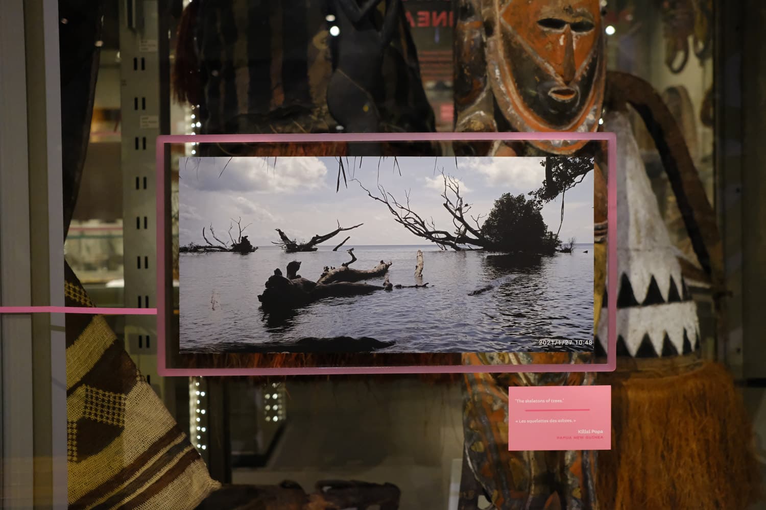 This is Trouble in Paradise: Climate Change in the Pacific, a collection of photos originally commissioned by the UK Government in 2021 to coincide with the UN’s COP26 climate change conference in Glasgow. Mitiana Arbon, who curated the photos for MOA, tells me that all of it is designed to disrupt the space. An “intervention” rather than an exhibition, this version of Trouble in Paradise aims to use the current reality of anthropogenic climate change as a lens for looking at the museum’s historical Polynesian, Melanesian, and Micronesian objects. The photos and words may seem out of place, but that only draws attention to what’s out of place in our climate, and the out-of-placeness of the museum’s objects.
