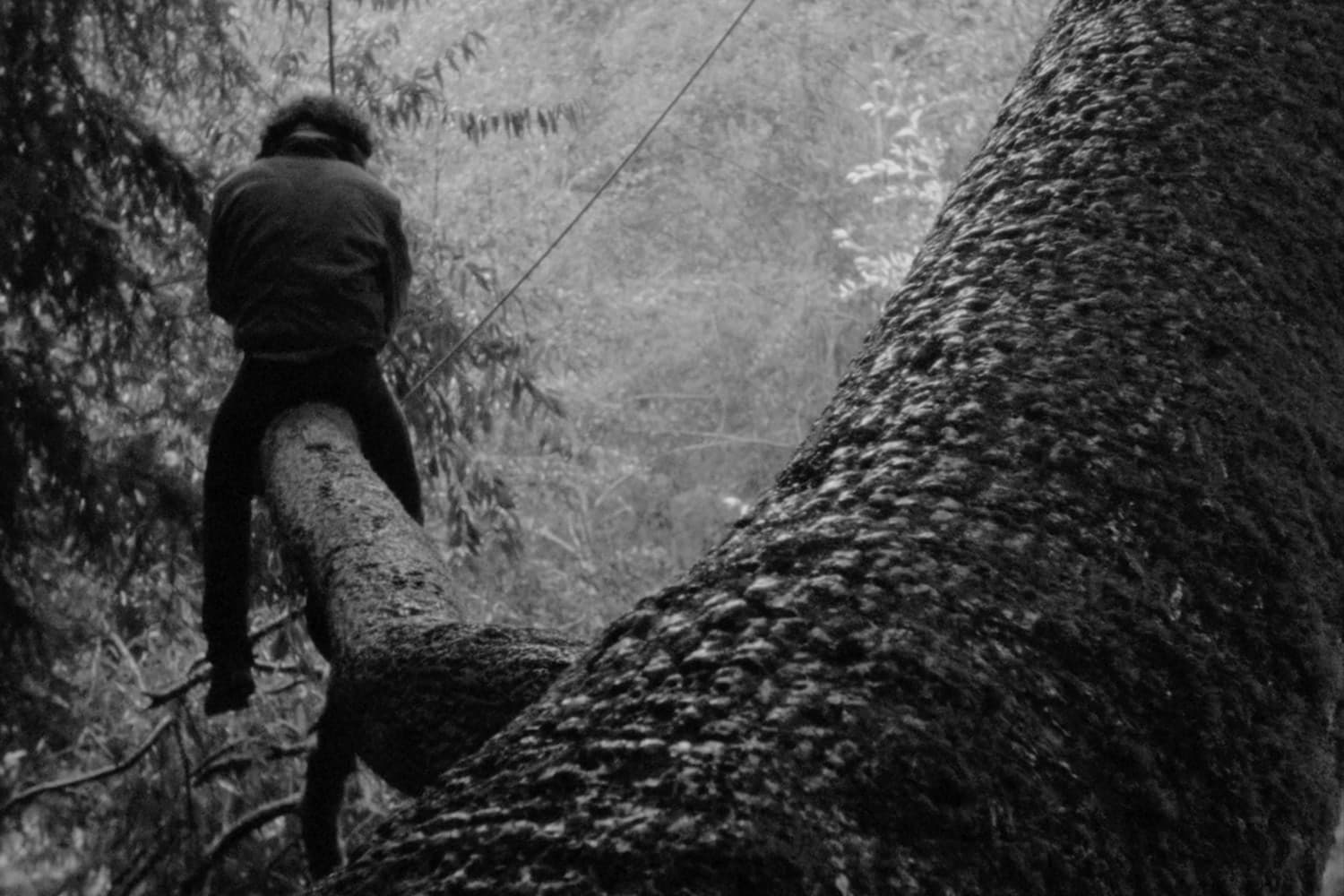 Artist and filmmaker Brigid McCaffrey shot the entire documentary on 16 mm black-and-white film over six years, between 2016 and 2022. Unlike high-definition video, the black-and-white imagery foregrounds shadows, obscuring detail—an effect that mimics the “reclusive hiding” and “impenetrability” of the forest, she explains. “While it was very hard to shoot in the forest in black and white… I thought it spoke to some of the themes of the film.”
